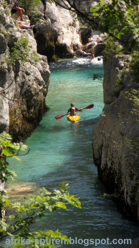 fahren wir, am Zusammenfluss der Soca und Koritinica, das Paddlercamp